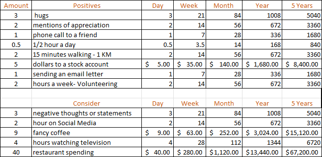 Thank you for your comment, very true and I agree. The table I made I hoped it would illustrate that small steps, and small sacrifices lead to big gains or big savings. Plus I liked thinking about all tens of thousands of hugs and kisses to my wife that have added up over our 40 plus years together. ♥