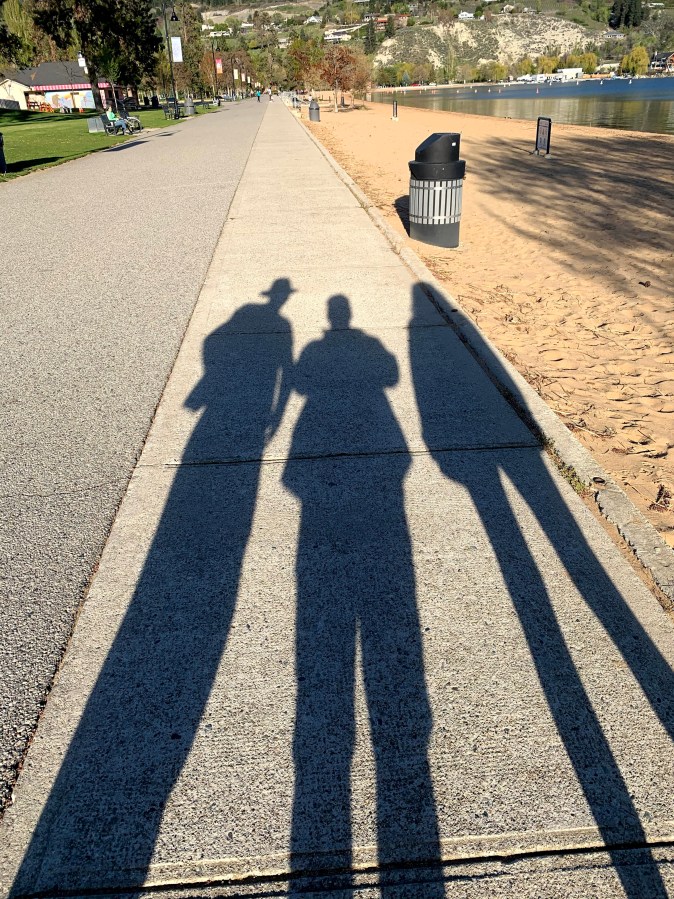 walking along Skaha Lake, Sun in the east is going down giving the long shadows