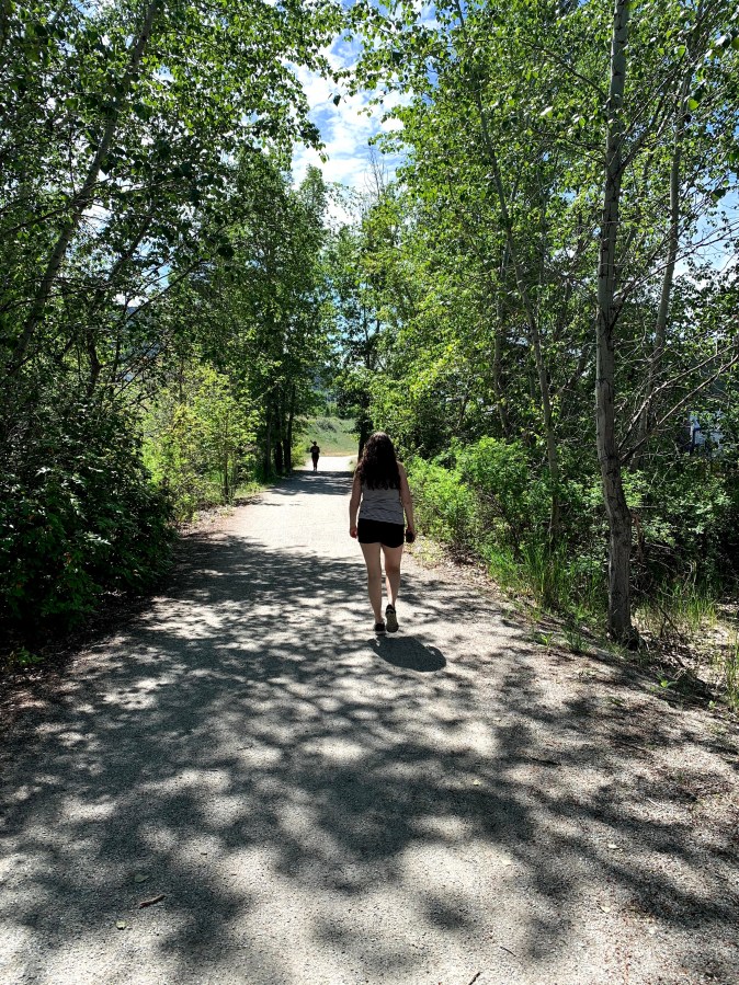 An old railway bed is the chosen spot for walks lately, the KVR (Kettle Valley Railway) and that’s my wife getting ready to run